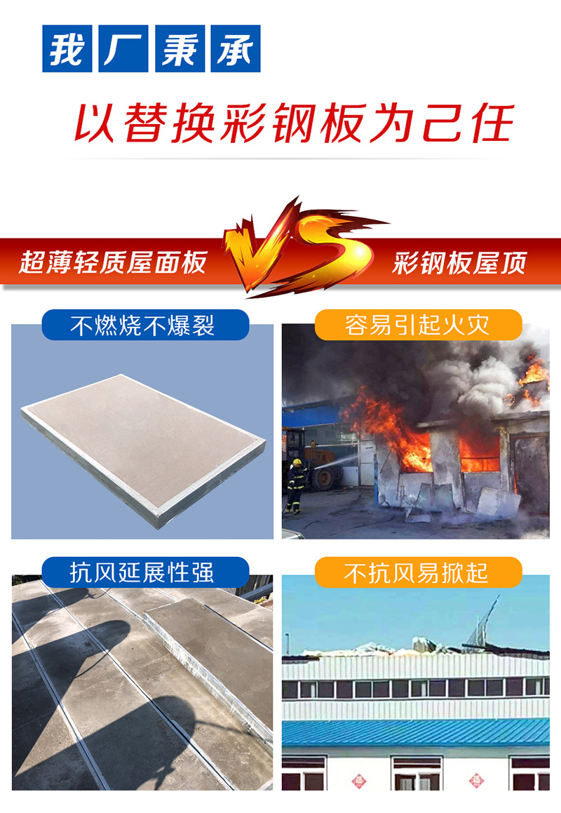 为了避免彩钢板种种劣势有可能会给我们带来损失,满足人们对现代家装的要求,特推出钢骨架轻型板-超薄轻质屋面板,这款板材集防火、抗风、抗震、承载力大、耐久、轻质、保温隔热及安装便捷等功能于一体新型建筑材料,既保持了传统 钢筋混凝土板的强度、使用寿命长的优点,又满足了现代建筑对材料轻质保温的要求,实现了 钢结构建筑屋面、楼面、墙面的轻型化及多效性。彻底解决了金属彩钢板存在诸如使用寿命、耐火极限、荷载能力 施工工序、节点漏水、保温隔声性能等一些难以克服的缺陷。现被广泛应用于工业 厂房、酒店、商场、学校、医院、仓库、地铁及高铁车辆段、大跨度钢结构、网架房屋屋面、 体育场馆等公用、民用建筑。