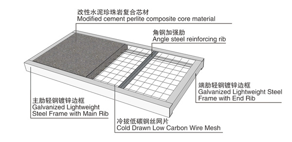 2、高强:采用轻钢骨架和发泡混凝土轻质芯材的组合结构,虽然是轻质板,却保持了传统钢筋混凝土重型板承载力大、安全度高的特点。